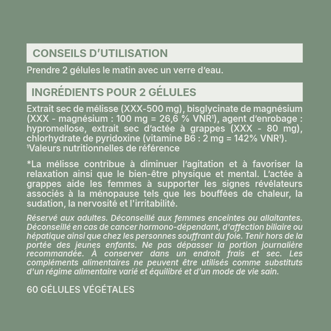 *La mélisse contribue à diminuer l'agitation et à favoriser la relaxation ainsi que le bien-être physique et mental. L'actée à grappes aide les femmes à supporter les signes révélateurs associés à la ménopause tels que les bouffées de chaleur, la sudation, la nervosité et l'irritabilité.
